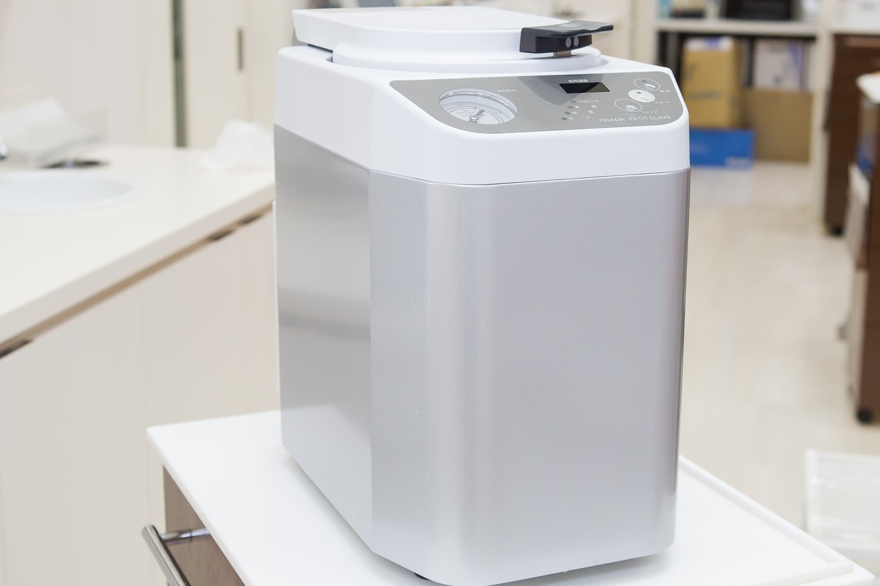タービンやハンドピース(歯を削るときに使う機器)の専用滅菌器です。患者さまごとに滅菌された機器を使用できるようになるため、院内感染の予防に効果的です。